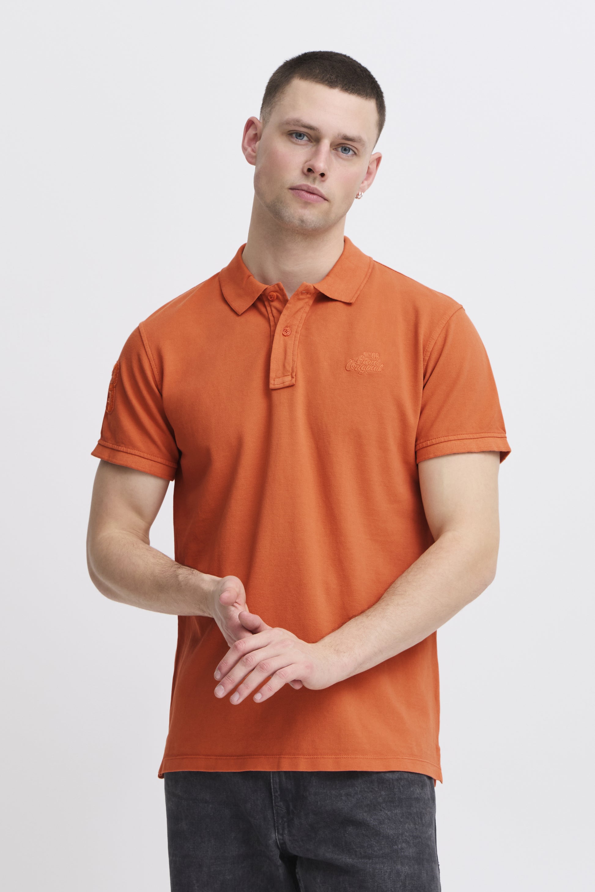 Classic polo shirt in regular fit, plain block colour with '93' tonal logo on sleeve, small slits in both sides of hems.